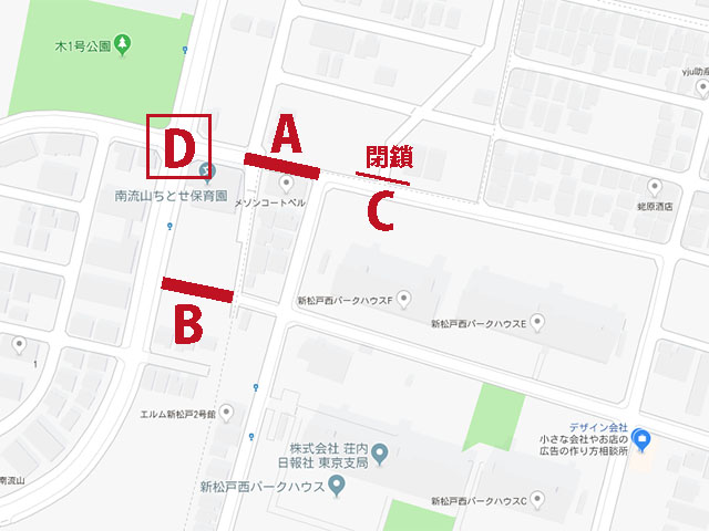 さらに、南流山の木1号公園の角に信号機が付きました(Dの場所)。いつか付くと思ってた人、多いと思います。ちっちゃい子が多い場所だしね。