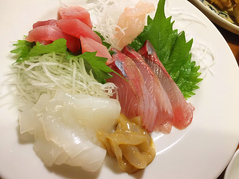 あと、もれなくお刺身七点盛りが付いてきます(笑)。ちなみにこの日は、マグロ、アジ(たたき)、ウニ、カワハギ(肝あえ)タコ、カンパチ、タイの七種。こちらがメインでもおかしくないくらい、いいお刺身でしたよ〜。